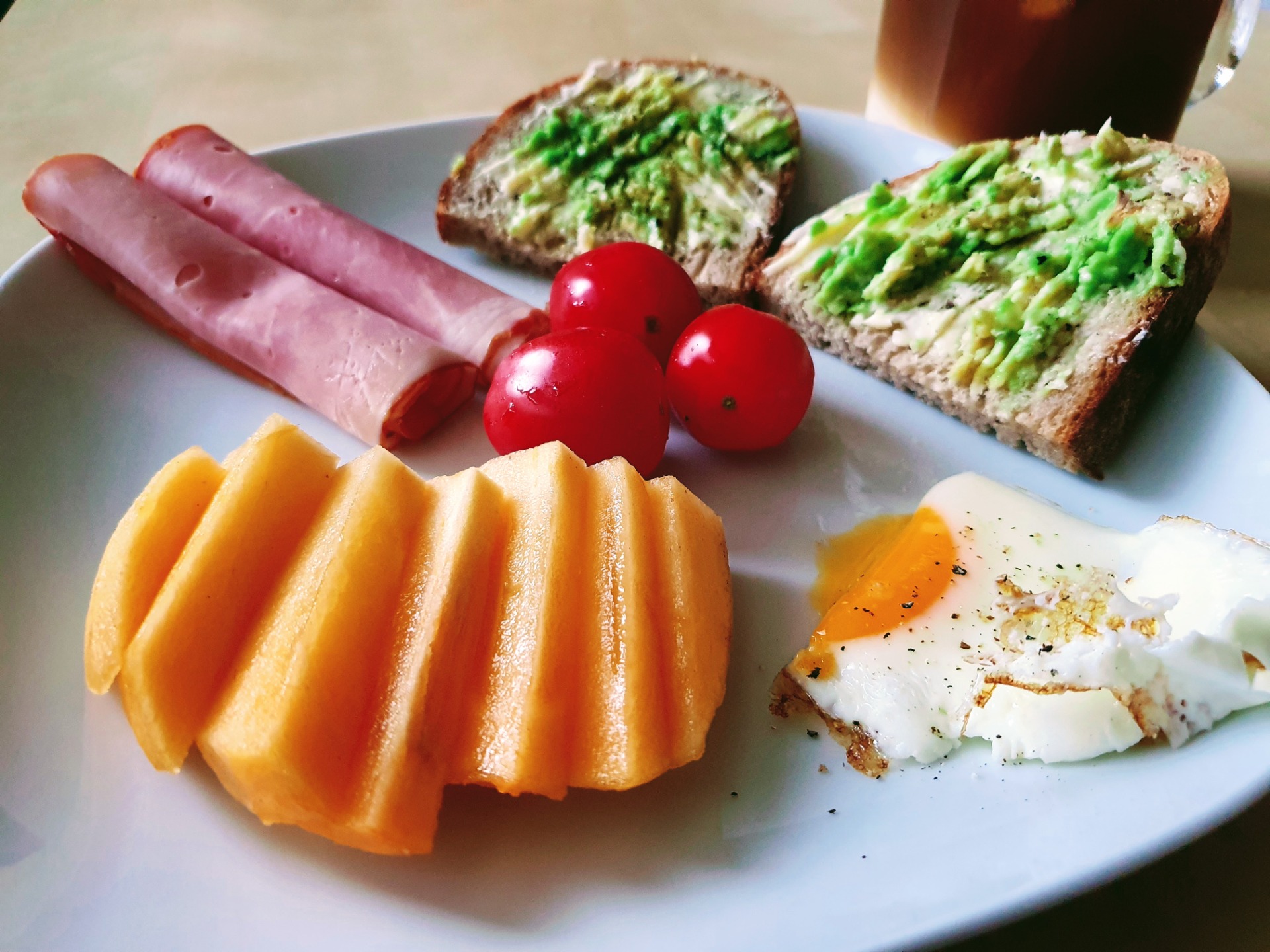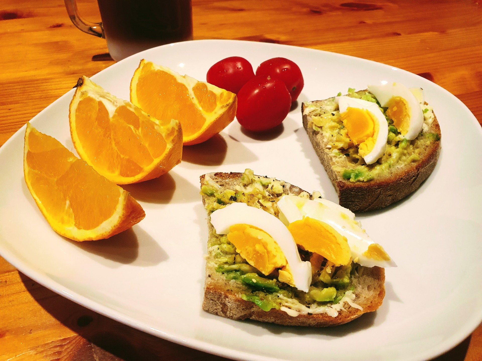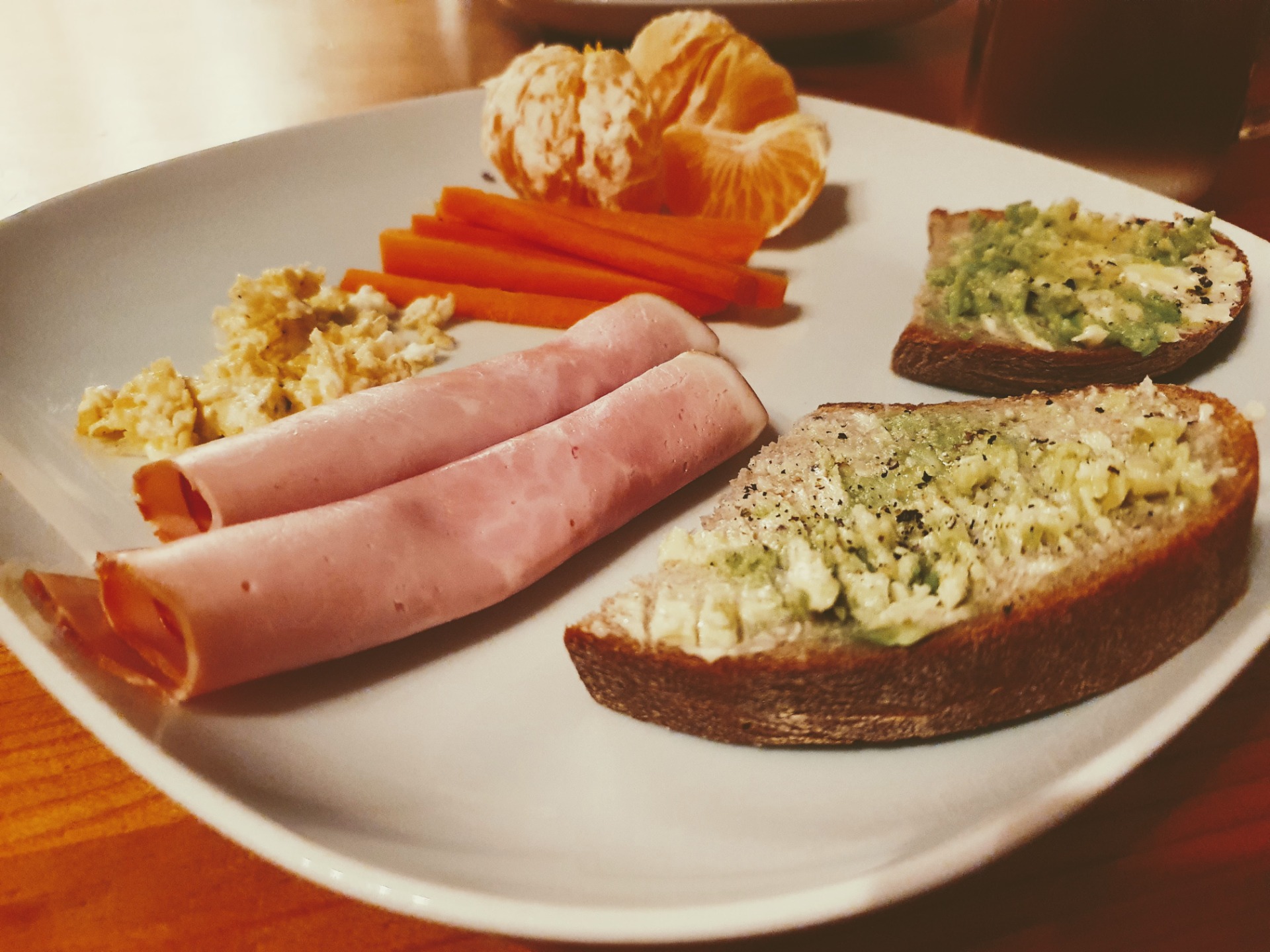 Káva s mlékem bez cukru, 1 šumivý multivitamin, 300ml vody, 50g žitného chleba Kabát, 5g másla, 15g avokáda, 34g burgunské šunky 96%, 25g vejce, 70g mandarinky a 25g mrkve