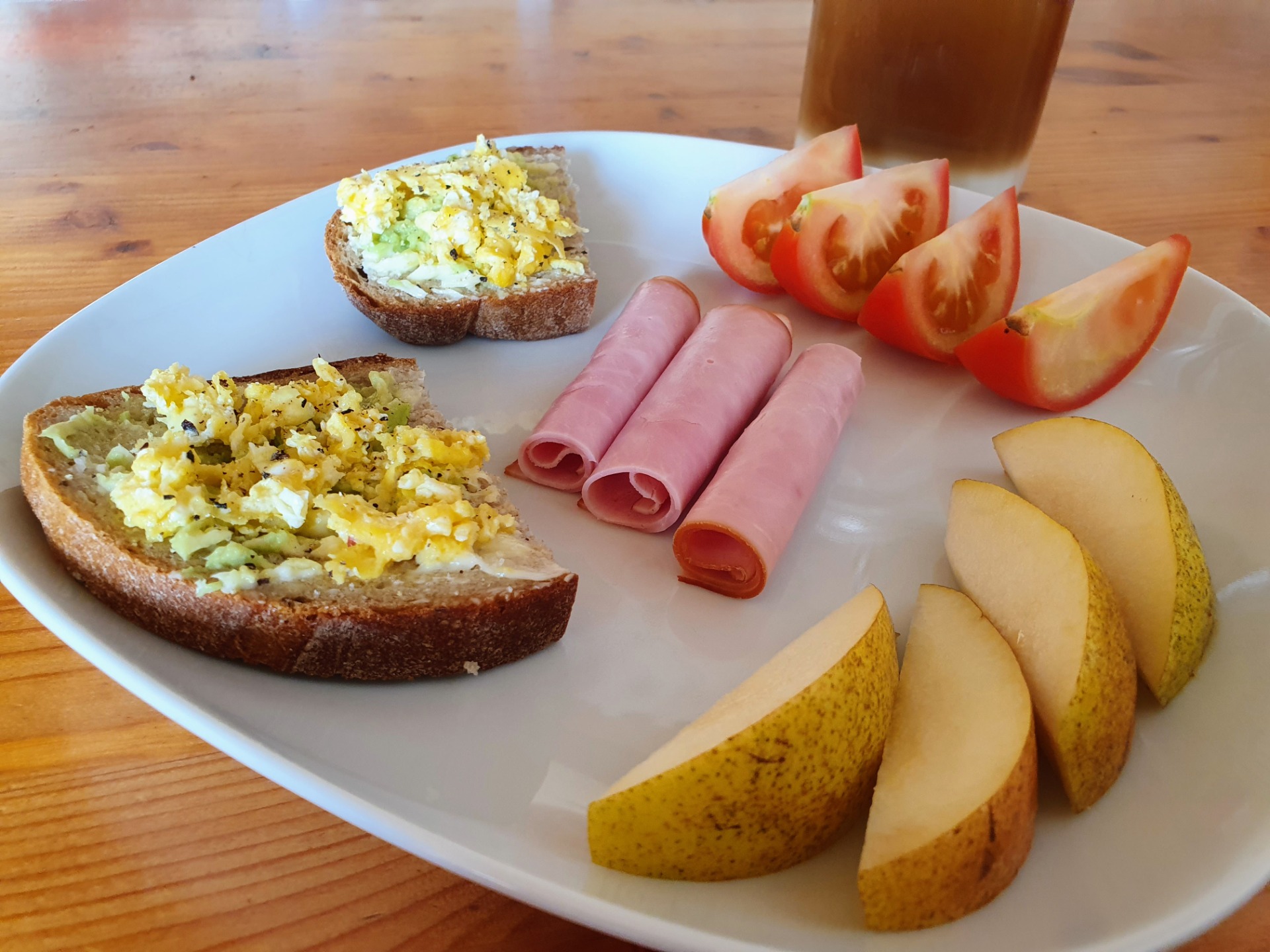 Káva s mlékem bez cukru, 1 šumivý multivitamin, 300ml vody, 50g žitného chleba Kabát, 5g másla, 15g avokáda, 20g eidam 20%, 25g vaječné omelety, 50g jablka, 50g červené papriky