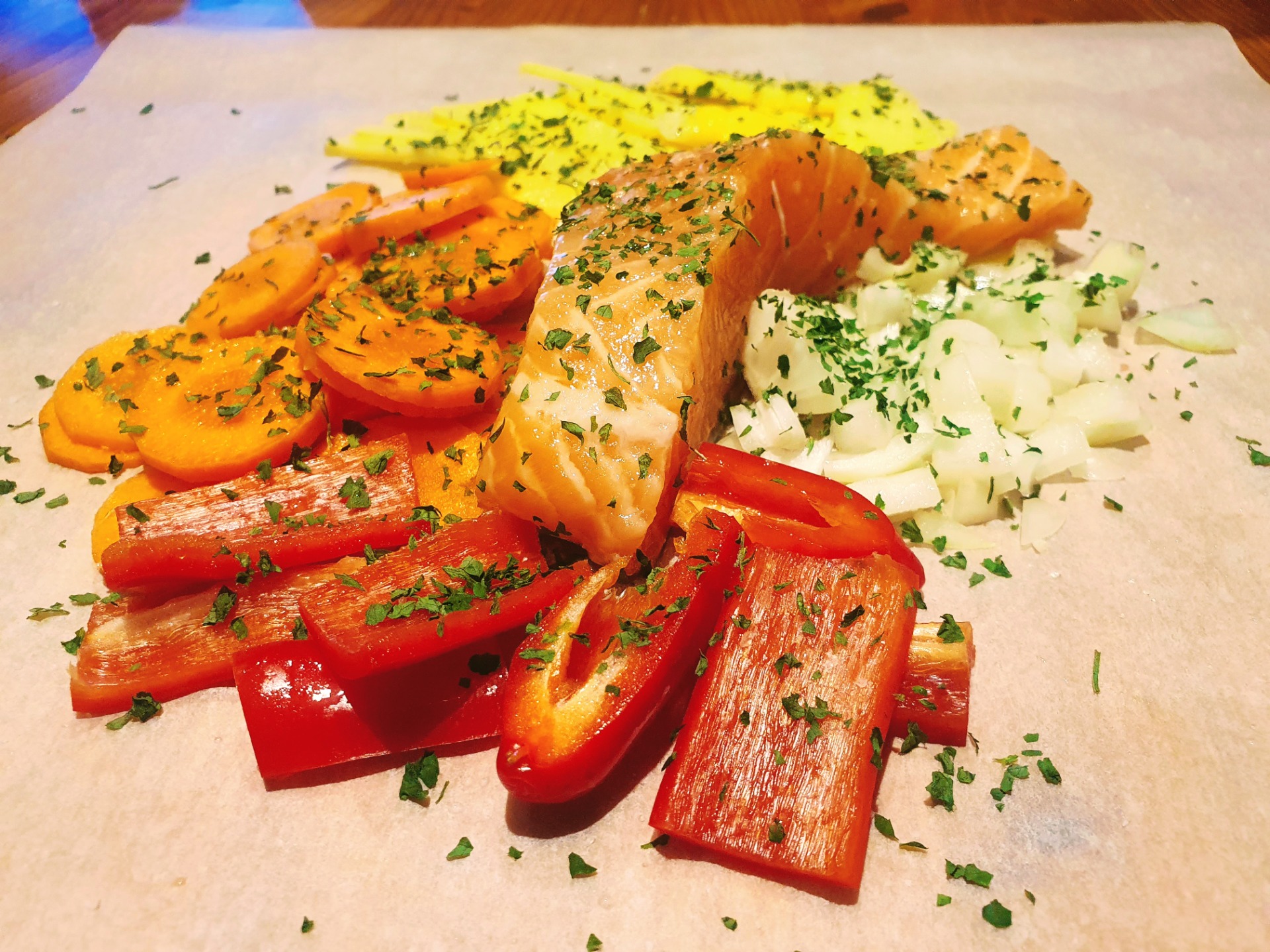 Hovězí plátek na kořenové zelenině s červenou paprikou a bramborovými gnocchi