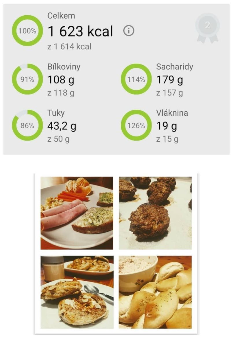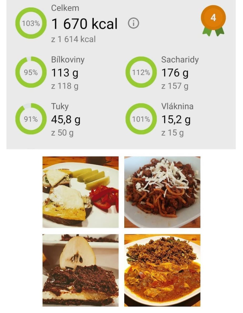 400ml kávy s mlékem bez cukru, 1 šumivý multivitamin, 300ml vody, 50g žitného chleba Kabát, 5g másla, 15g avokáda, 25g vaječné omelety, 20g eidam 20%, 50g červené papriky a 50g jablka
